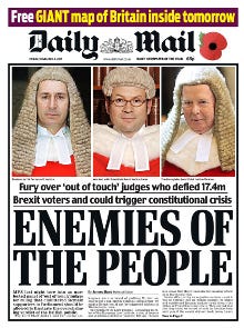 This wasn’t new. We have been here before. In November 2016, when the High Court ruled that Article 50 couldn’t be triggered without parliamentary approval, the Daily Mail printed photographs of three senior judges across its front page under the headline ‘Enemies of the People.’ Then as now, the legal ruling was minimal: a question of process, not substance. Then as now, the right framed it as a betrayal.