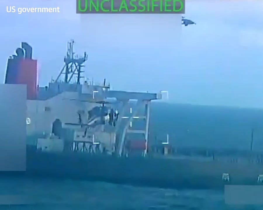Attorney General Pam Bondi released video of the operation. Men fast-roping from helicopters onto the deck of a commercial vessel. Armed personnel moving through the superstructure. The footage distributed on social media like a trailer for an action film.